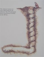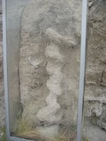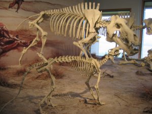 Palaeocastor 私たちが面白いと思ったのはこの化石です。陸上に生活するビーバーみたいな生物が、ここに巣穴を掘って地下に住んでいたようです。左右の写真の通り、らせん状の巣穴がそのまま化石となって残っています。ただ、相当に脆いため簡単に風化するようです。 Menoceras サイの仲間が北アメリカに住んでいたとのこと。下の写真で大きいものがMenocerasです。 Daphoenodon 犬に近いものの、現在の犬とは異なる種だそうで、絶滅してしまったそうです。下の写真で小さいものがDaphoenodonです。 |