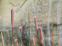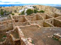 Mesa Top Trail エルモロとは「岬」という意味だそうです。垂直に切り立つ岩山は、確かに海に突き出すように立つ岬に似ています。 エルモロの頂上への道のりはけっこうきつい急坂です。上りはじめには横なぐりの雨が降っていましたが、途中で急に青空が広がりはじめました。頂上に着いたときには、すっかり晴れてしまい、上機嫌になりました。たった60mの高さしかないエルモロですが、周りに障害物がないので気持ちがいい眺めが広がっています。 頂上付近には先住民の住居跡が残っています。いつもの石を積み上げた住居で、キバ Kiva もちゃんとありました。どうしてこんなところに家を建てたのでしょうね。外敵から身を守るのに都合がよかったのかもしれませんが、獲物を持ち帰るのは大変だったと思います。何はともあれ、いい景色のところに家を建てたものです。 |