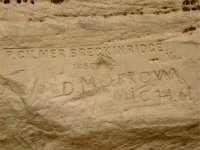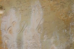 公園のビジターセンターに着いたときには、雪まじりの強い雨が降っていたので、トレイルはやめようと思ったいました。ところが、展示を見ているうちに雨が上がったため、レインコートを着て歩き始めました。■インスクリプションロックトレイル Inscription Rock Trail エルモロの岩壁に刻まれた壁画やサインなどの碑銘を探しながら歩きます。これらは昔の人の落書きです。下手くそなものから、芸術的なデザインまでさまざまです。年代が記されたものも、1690年〜1910年とばらばらです。 もちろん、今は落書き禁止ですが、落書きもこうして後世に残されることがあるわけですから、うかつなことは書けませんね。 |