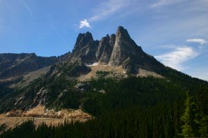 | ここはノースカスケードハイウェイ沿いですが、厳密にはオカノガン国有林 Okanogan National Forest のエリアになります。 ワシントン峠にある Washignton Pass Overlook から リバティーベル山 Liberty Bell Mt (2359m) が望めます。切り立った山と急勾配で登る道路を一望できる迫力のある展望台です。 |